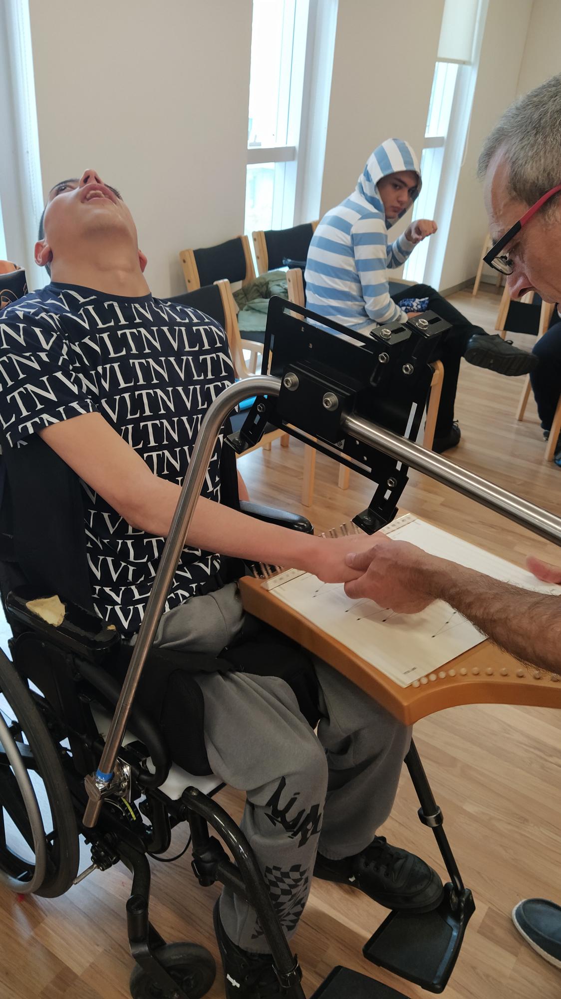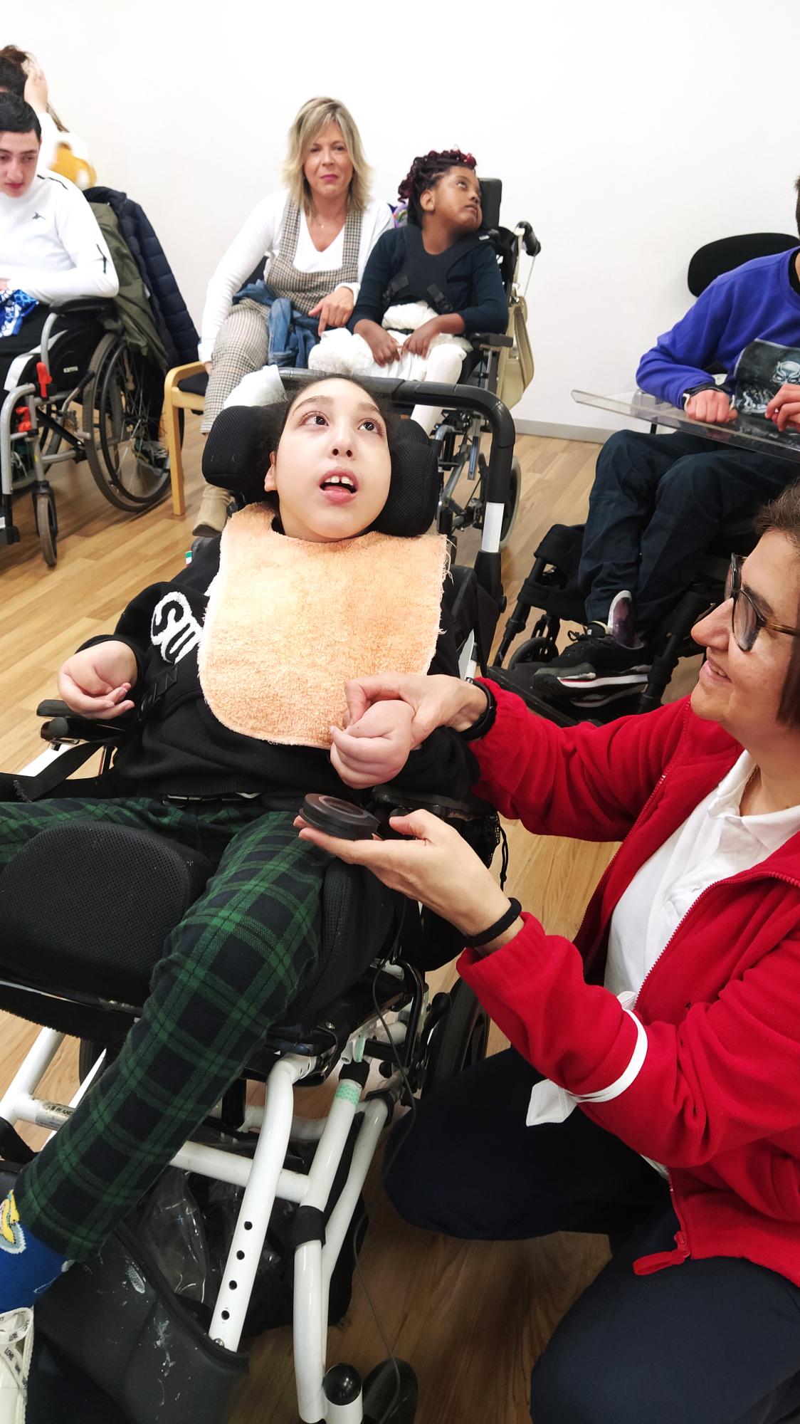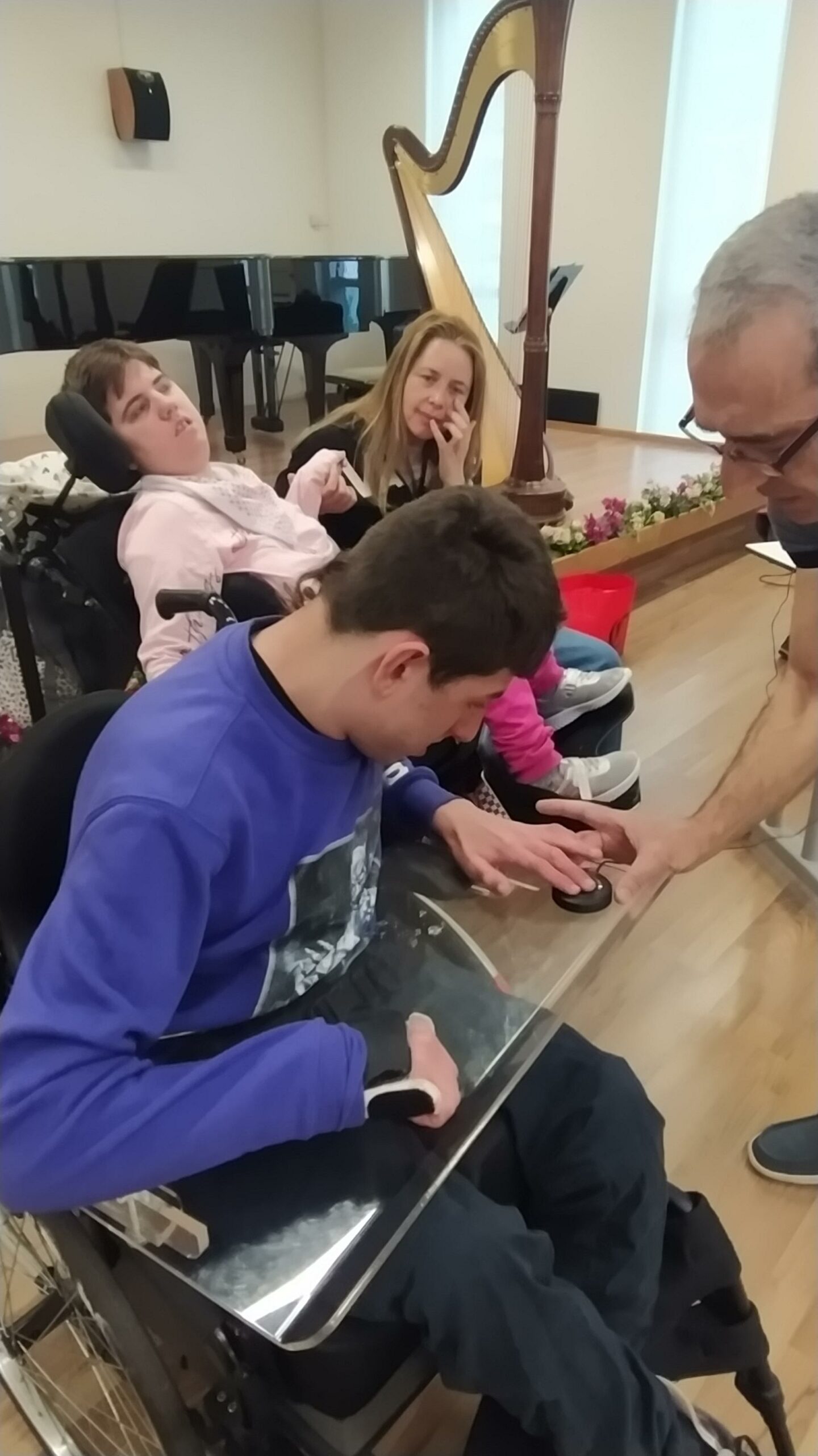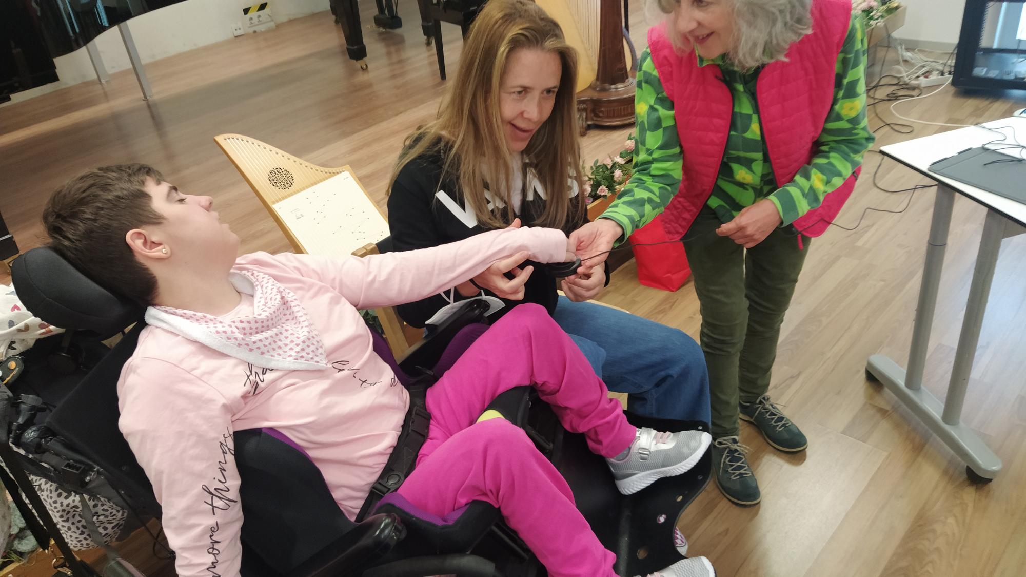 El taller se ha realizado en las instalaciones del conservatorio de música» Juan Crisóstomo de Arriaga, en Ibarrekolanda. El grupo de Aspace Bizkaia entraba en la franja o dentro del taller para niños y niñas. Tenían preparados algunos instrumentos que han podido manipular (como maracas, cascabeles, panderetas, etc.). De esta manera han podido participar cuando los ponentes tocaban sus instrumentos. Repartieron pañuelos para que pudieran moverlos como quisieran al escuchar la música o en el caso de algunos y algunas, han podido percibir la tela mientras escuchaban la música.