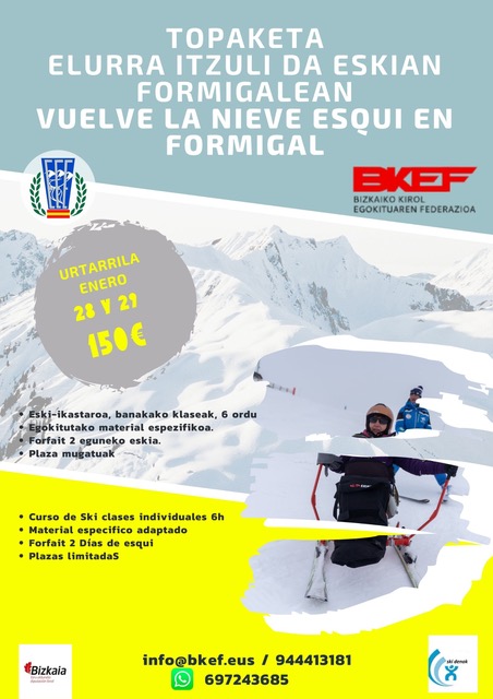 Esta jornada se desarrollará en la estación de esquí y montaña de Formigal donde la FDAB-BKEF tiene un convenio de colaboración con la escuela española de esquí y el club Skidenok, este acuerdo permite dar la opción a las familias de pasar un fin de semana esquiando, desde el sábado día 28 de enero al domingo día 29. El curso consta de 3 horas de esquí cada día, forfait, clases y material específico adaptado para la práctica del esquí, pudiendo también elegir la opción de esquari un único día según preferencias, o sábado 28 ó domingo 29.